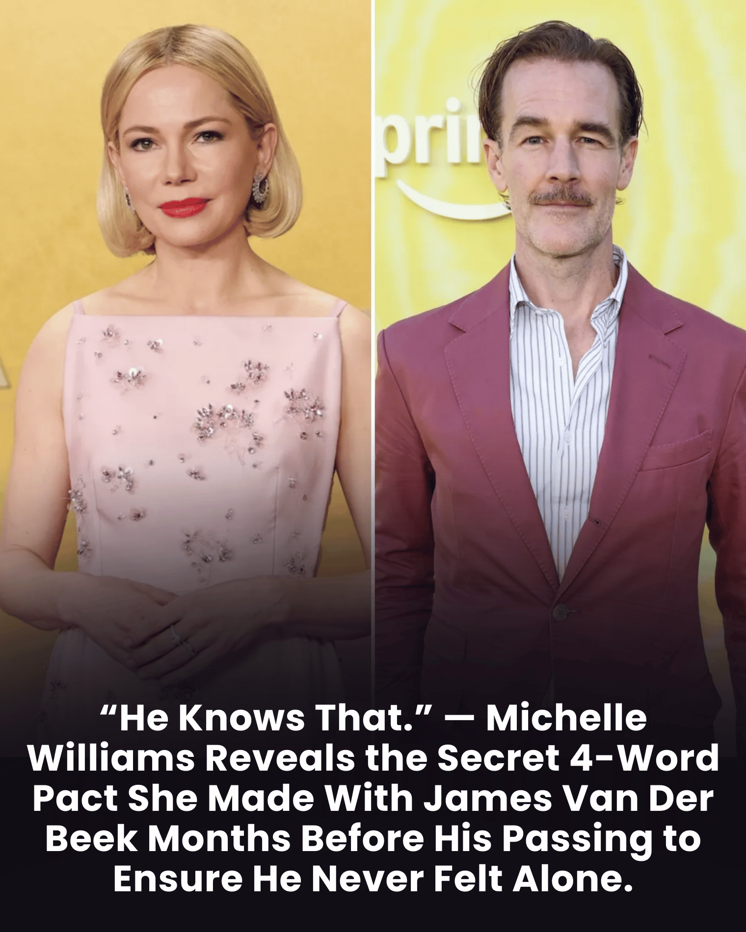In the quiet months before his passing, a simple four-word phrase carried the weight of a decades-long friendship. When Michelle Williams softly told reporters, "He knows that," she wasn't speaking in riddles. She was affirming a promise—one made privately to James Van Der Beek during the final stretch of his battle with colorectal cancer.